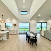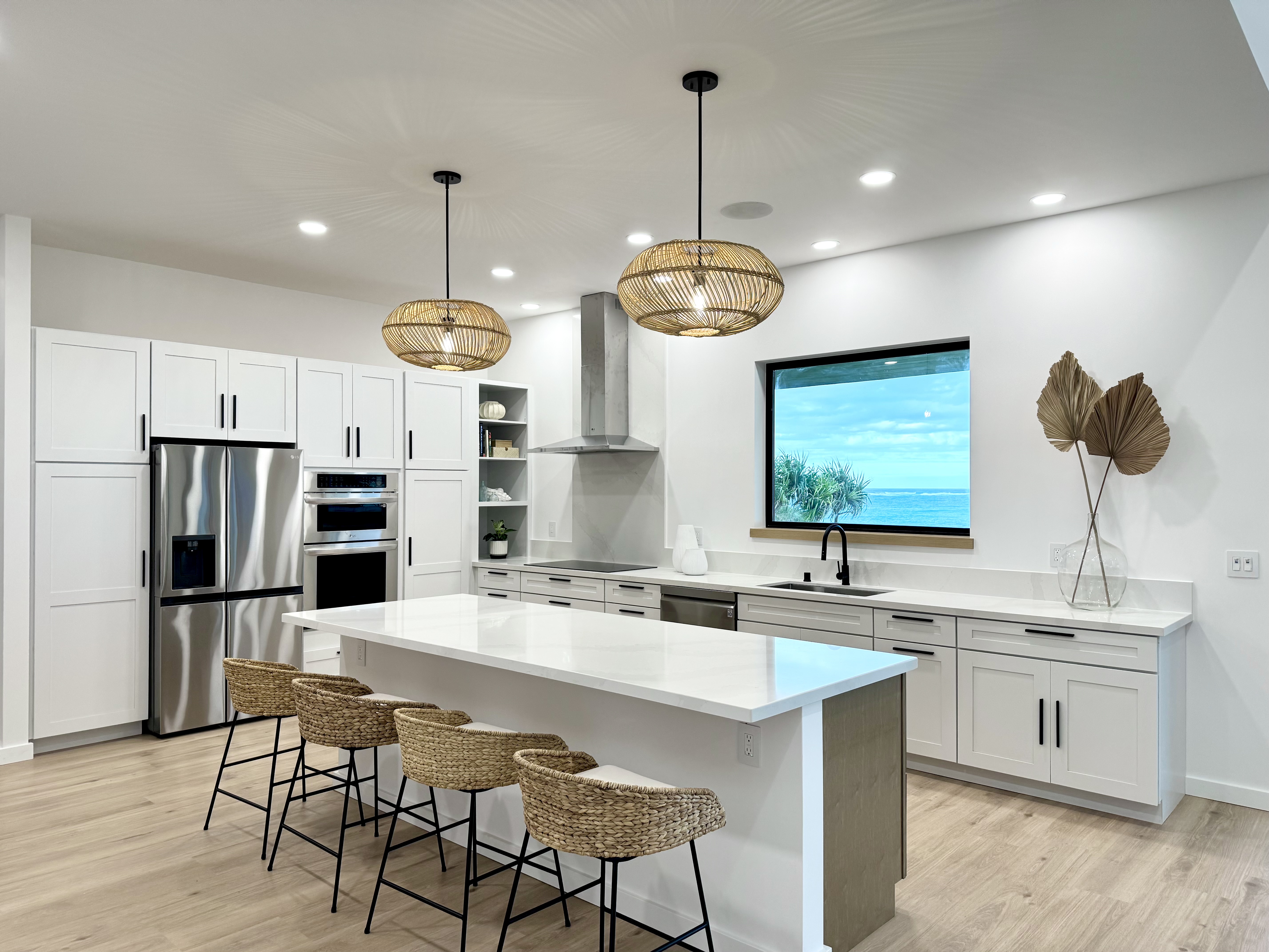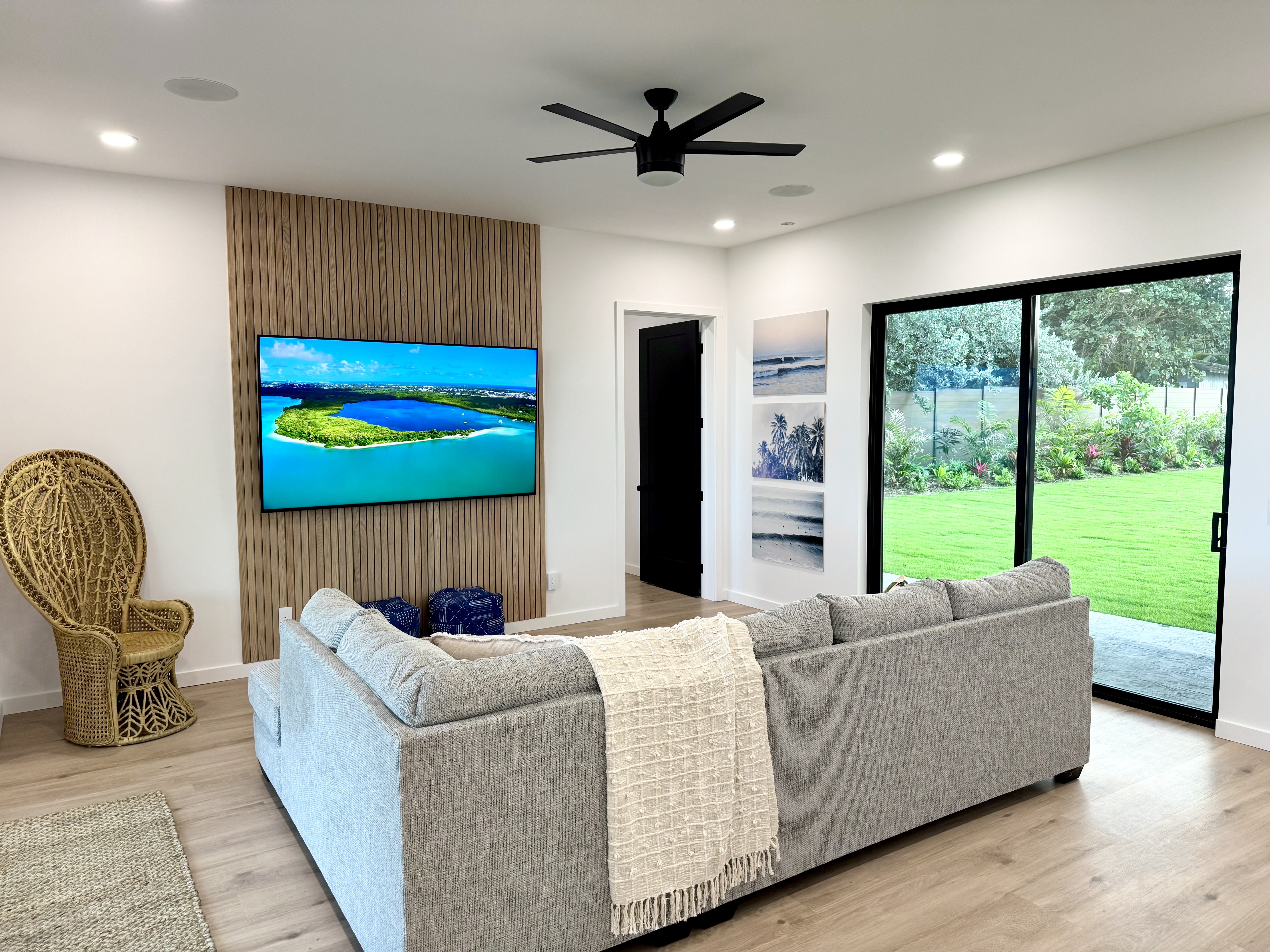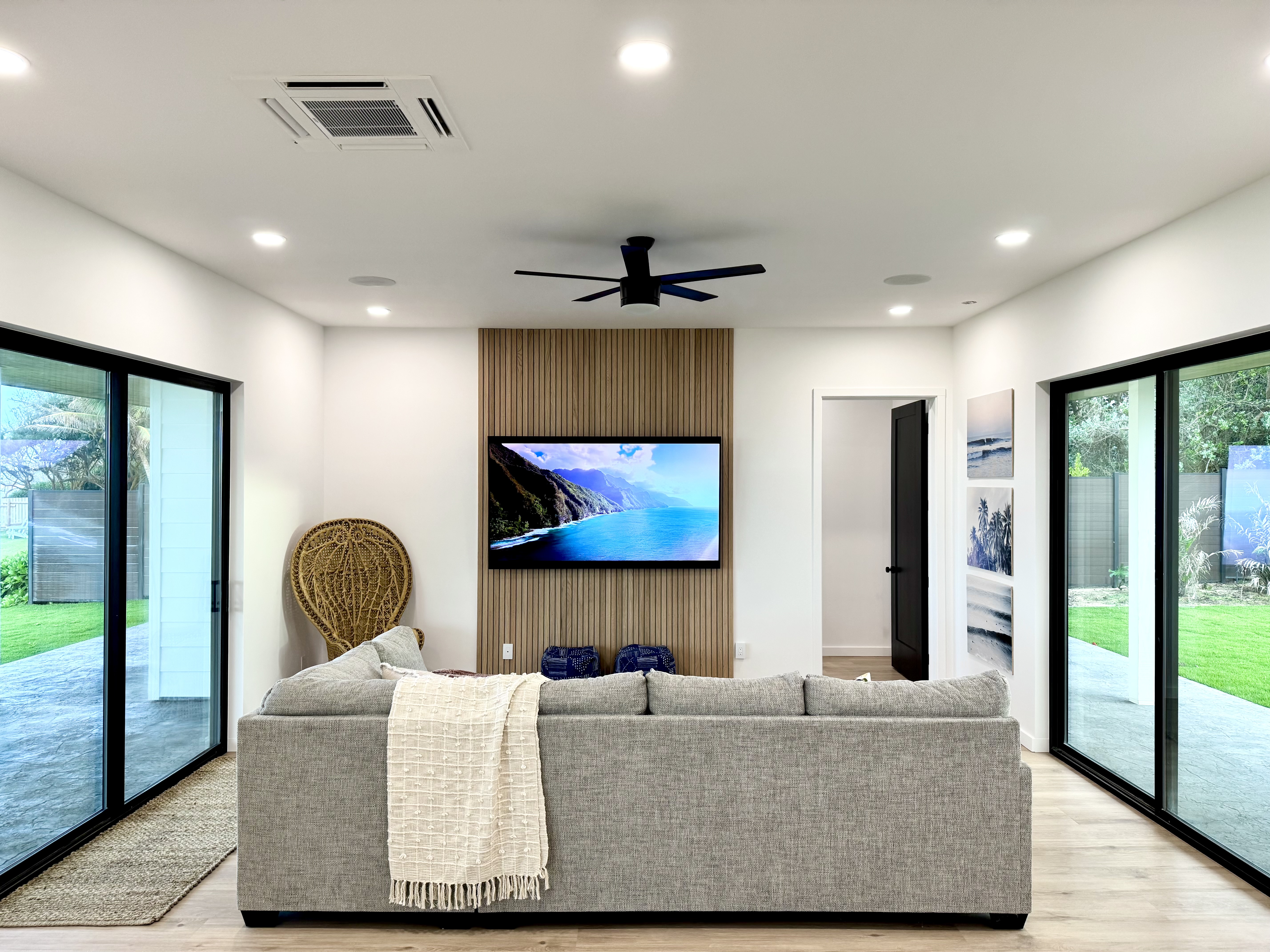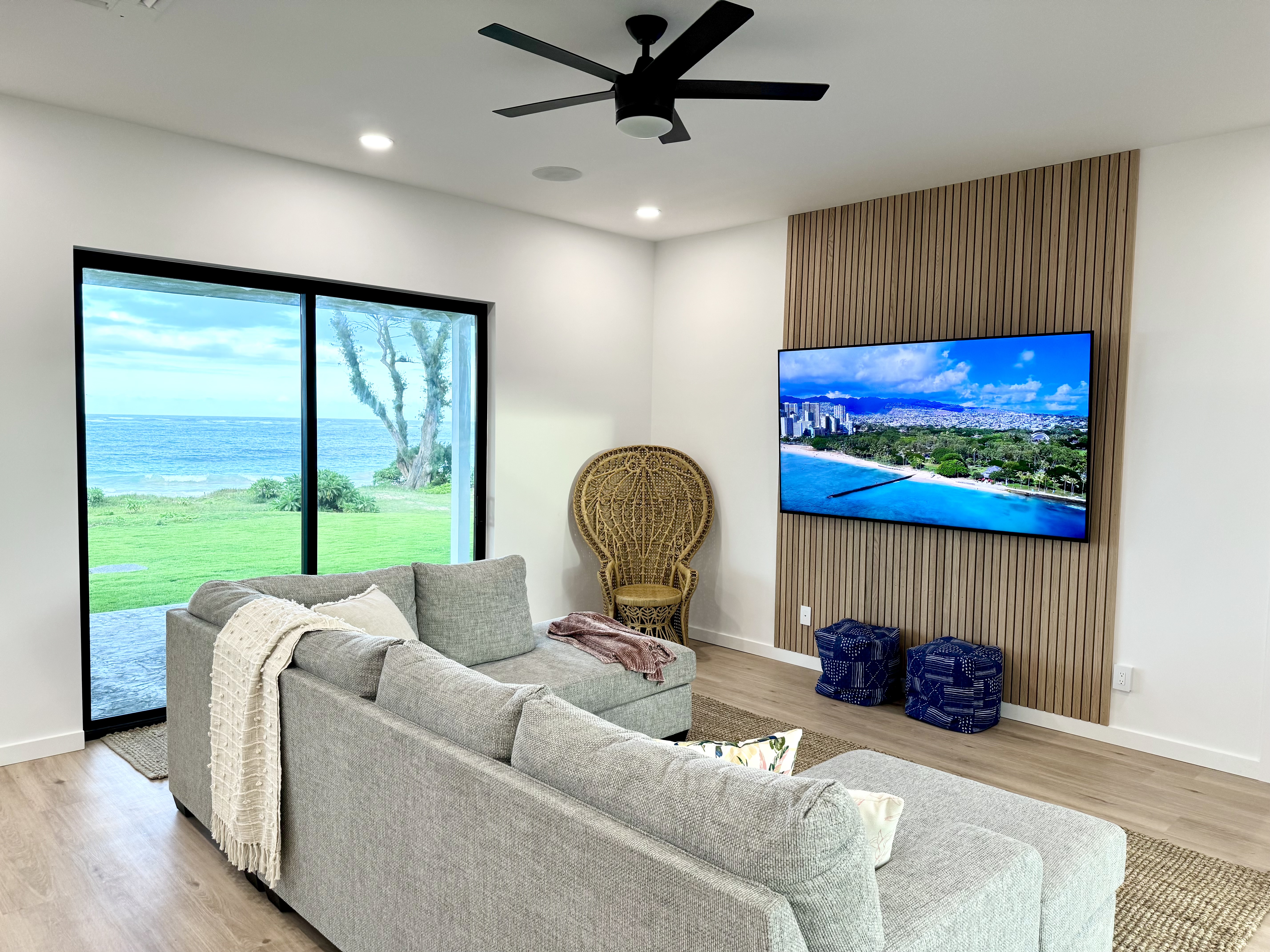 Rest and relax in our living room with ocean views on one side and our huge yard on the other. Simple, airy and perfect.
