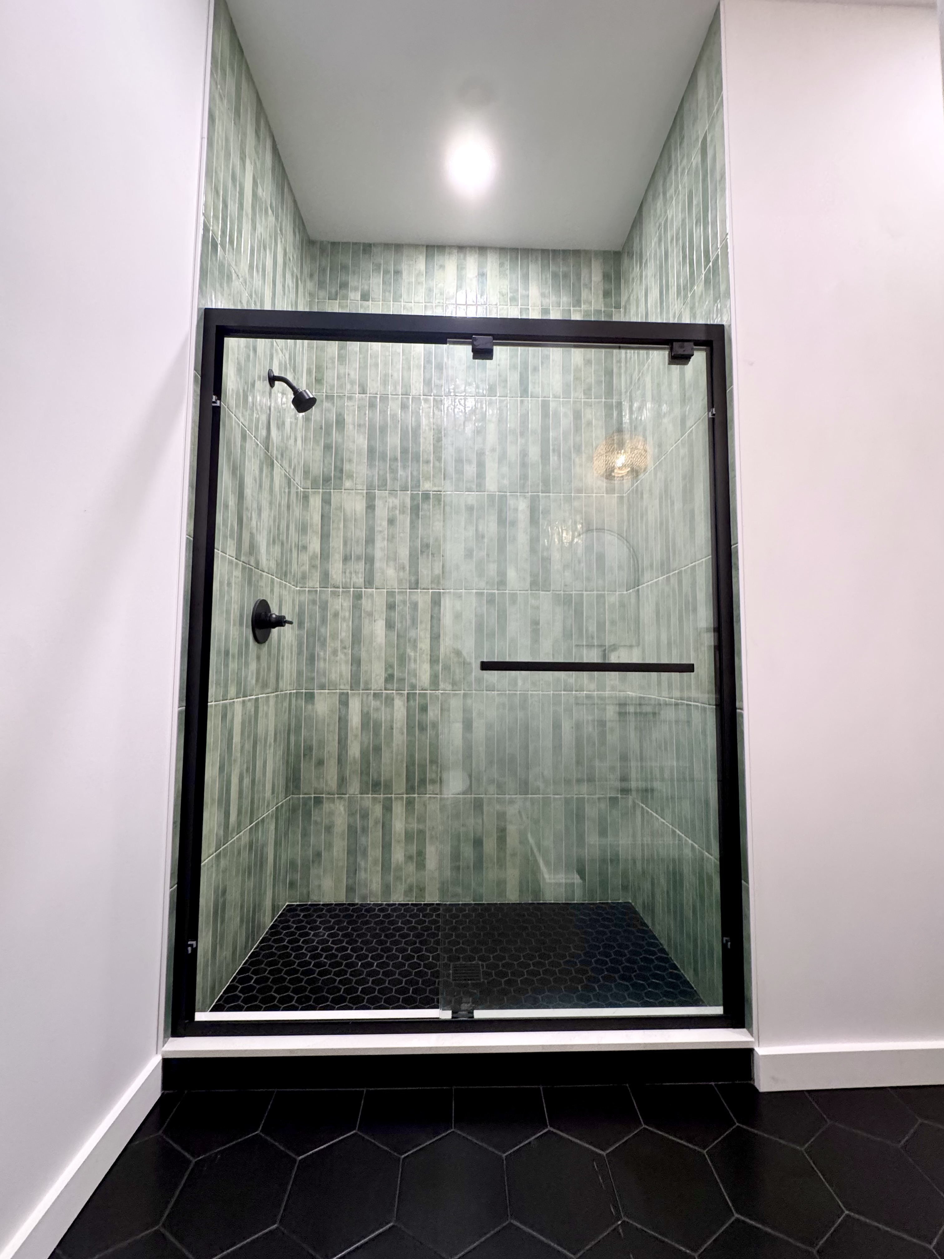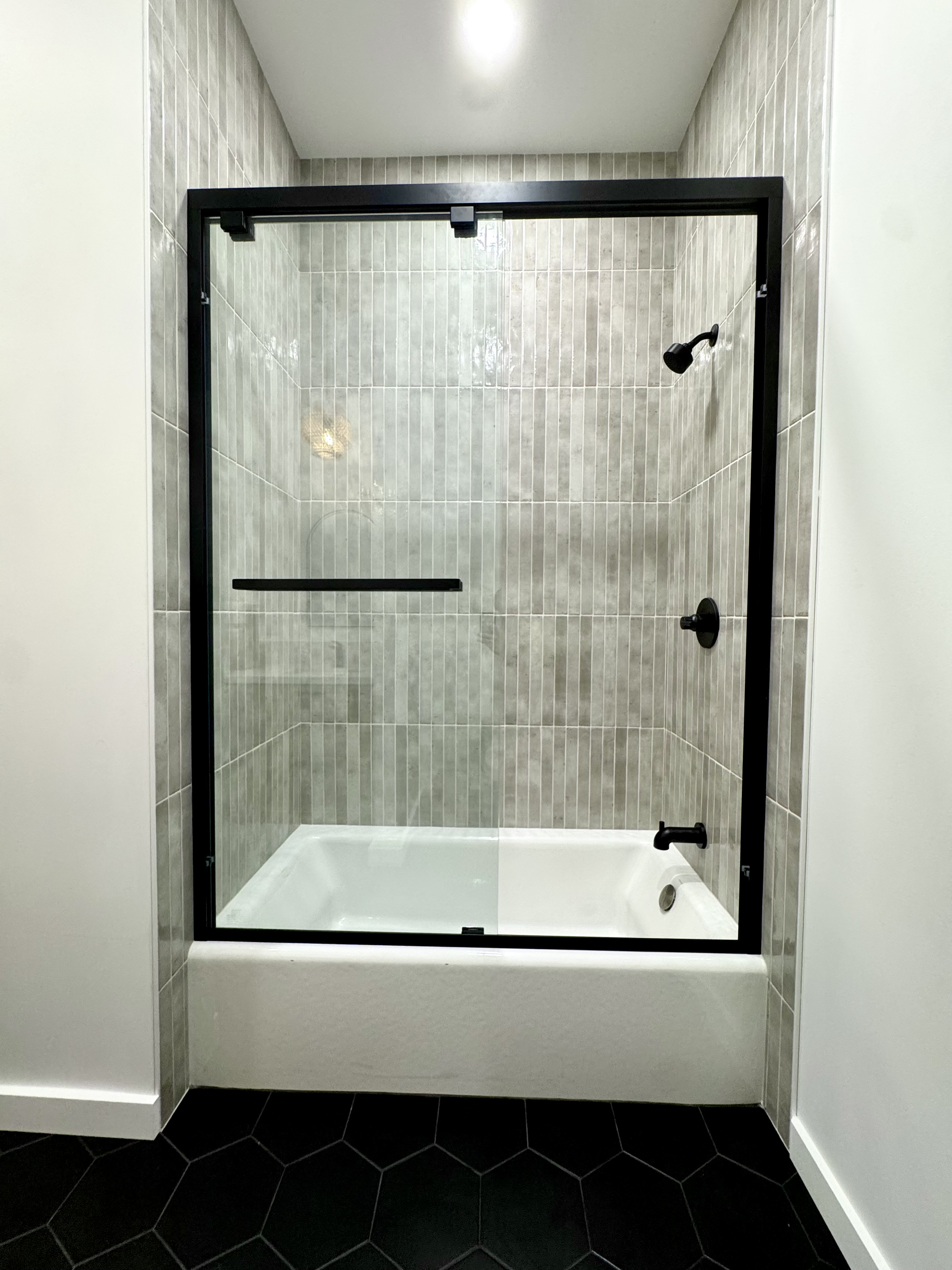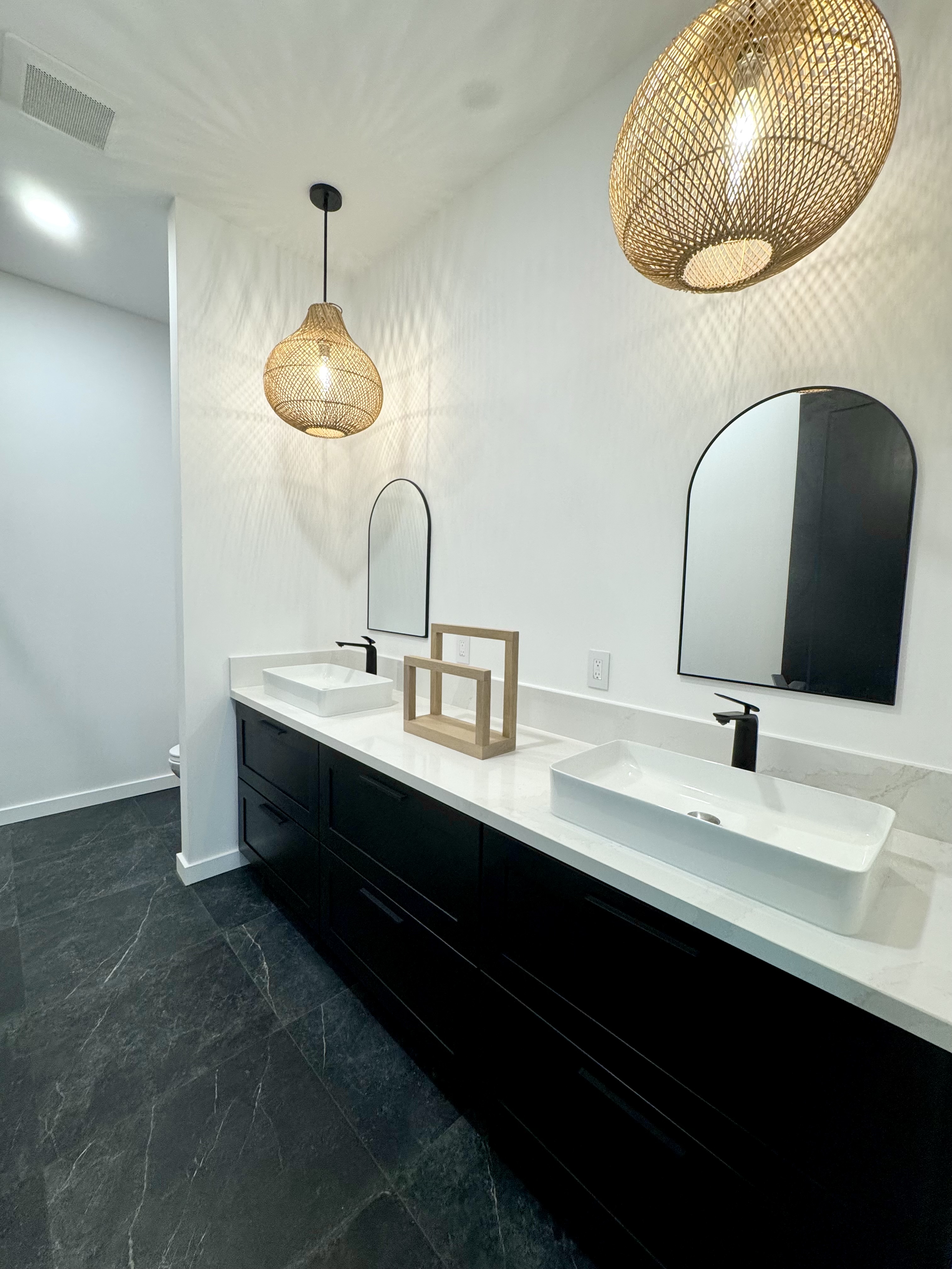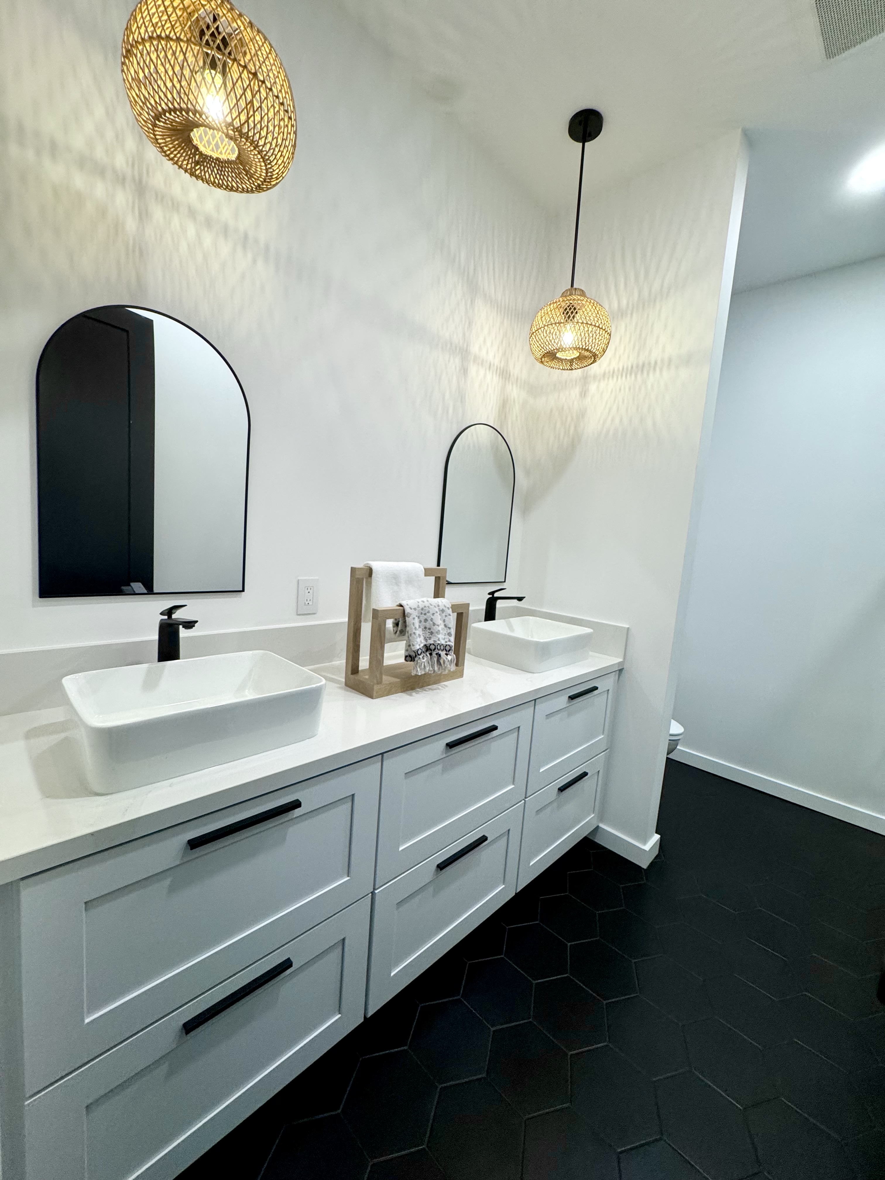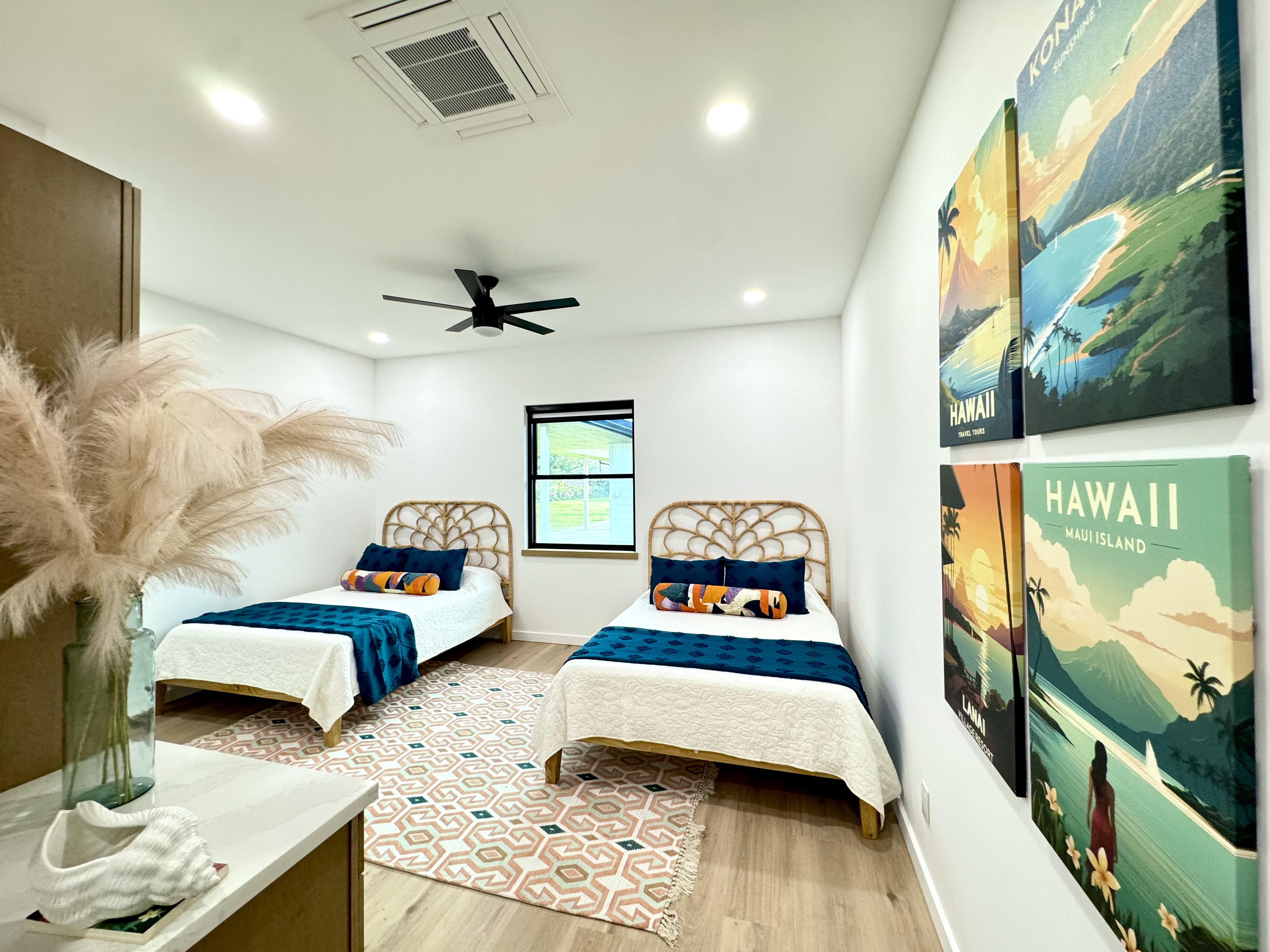 Our Second Bedroom is furnished with two queen beds with rattan headboards. It also has built-in closets and a dresser as well.. Each bedroom has a separate AC and ceiling fan. The ensuite bathroom is crisp and clean with modern black tile. Our second bathroom features a porcelain tile shower.