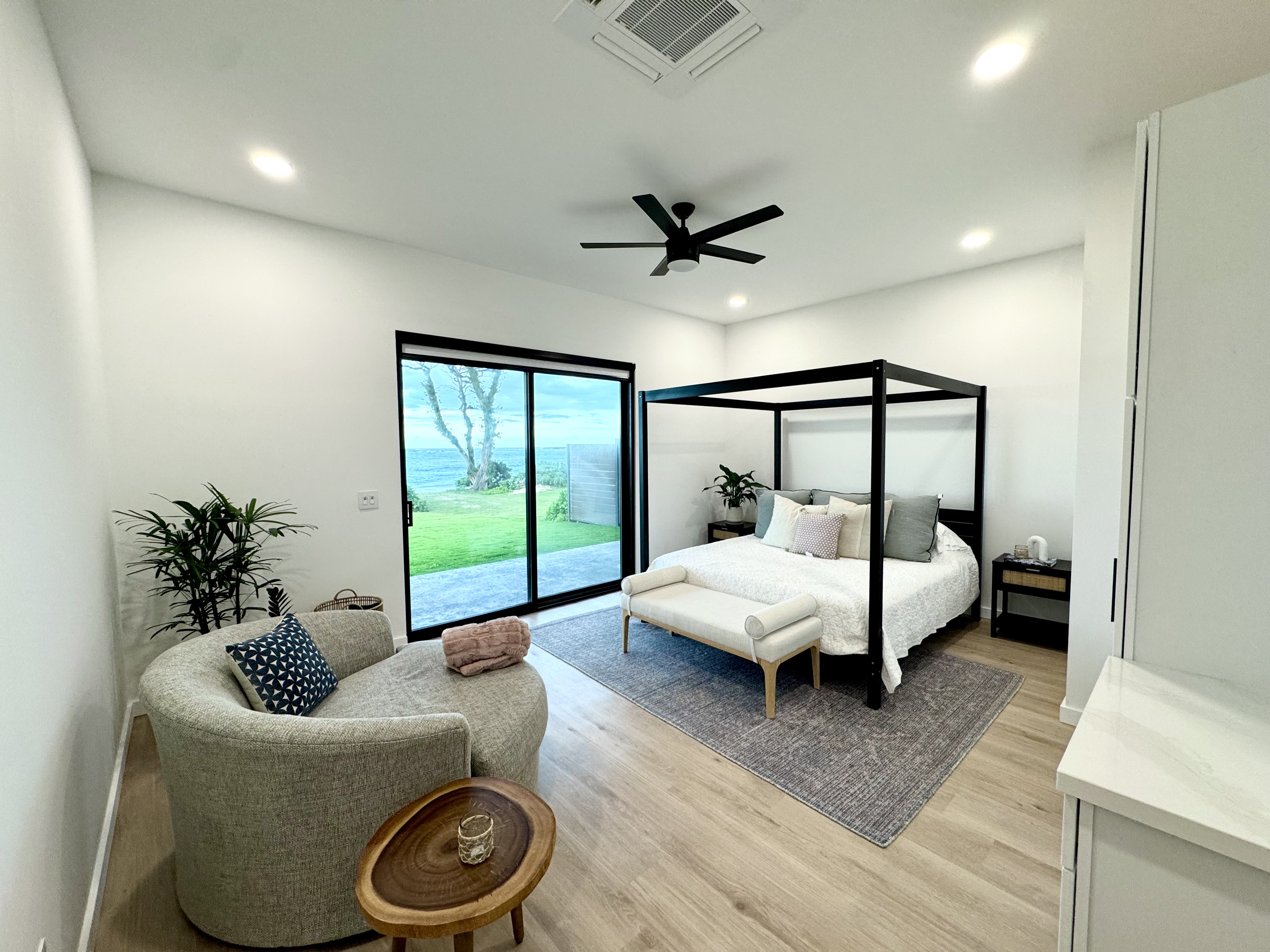 Our Master Bedroom is provided with a four post king bed and includes built in closets and dresser. It is simply furnished with a lounge chair, accessory table, plants, wood bench, and nightstands. Each bedroom has a separate AC and ceiling fan. The ensuite bathroom is stunning with modern bold black tile and a spacious shower.